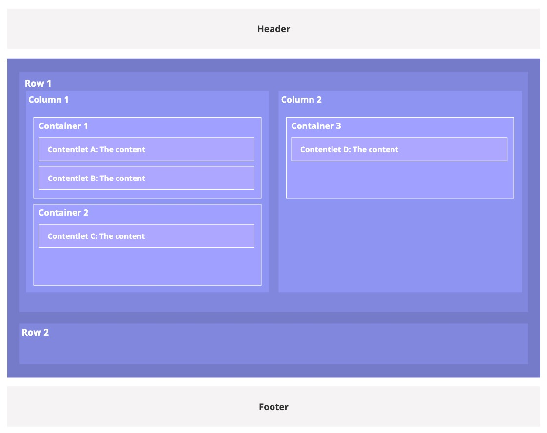 Rows → Columns → Containers → Content (e.g., news, events, blog posts).