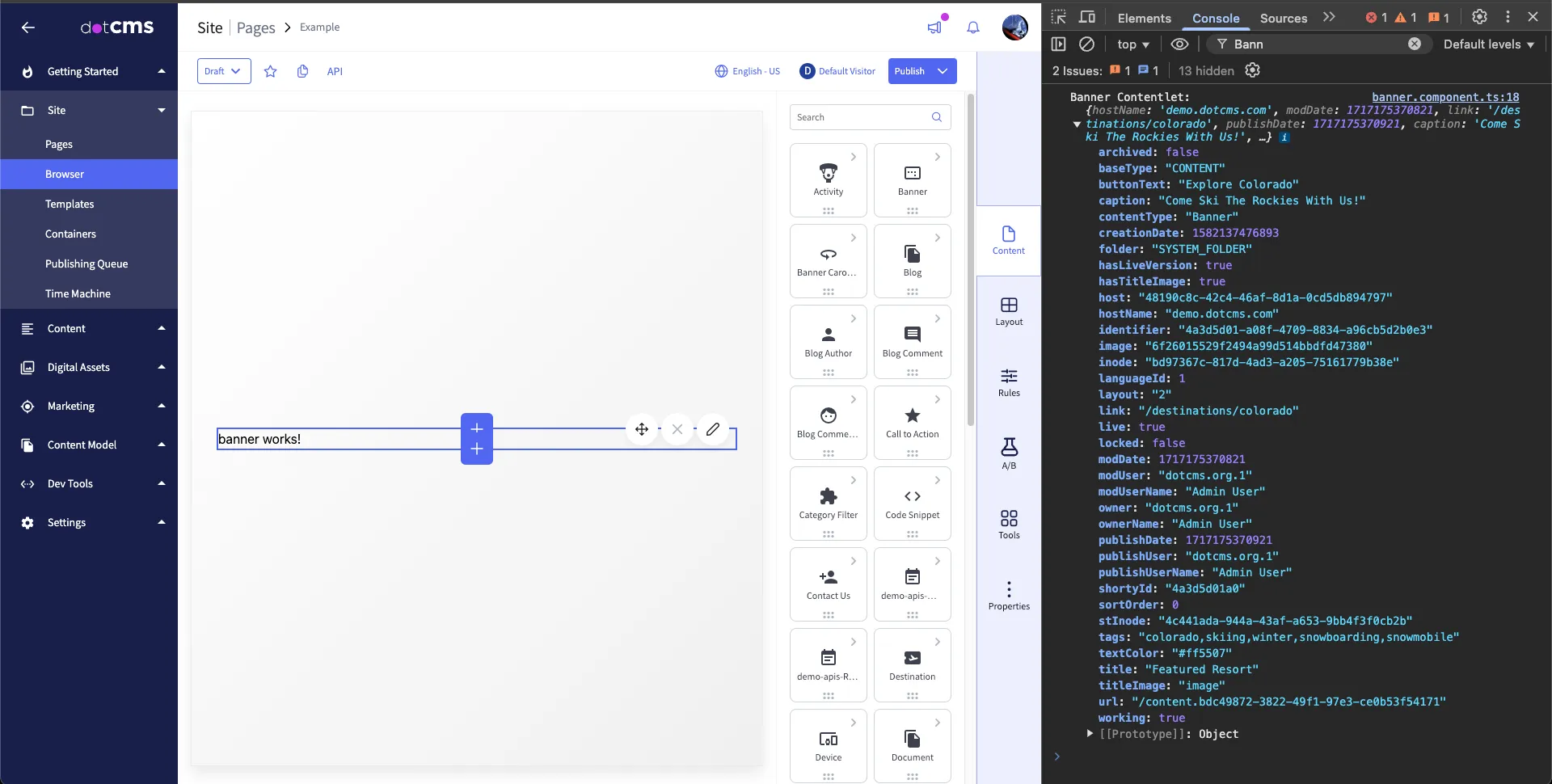 Internally, the <dotcms-layout /> component passes the Banner data as an input to our component. Because of this, our component needs an input of type dotCMSContentlet.