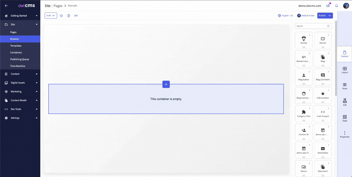 Let’s create the page we’ll use in this tutorial. Follow these steps to create the page in dotCMS:
