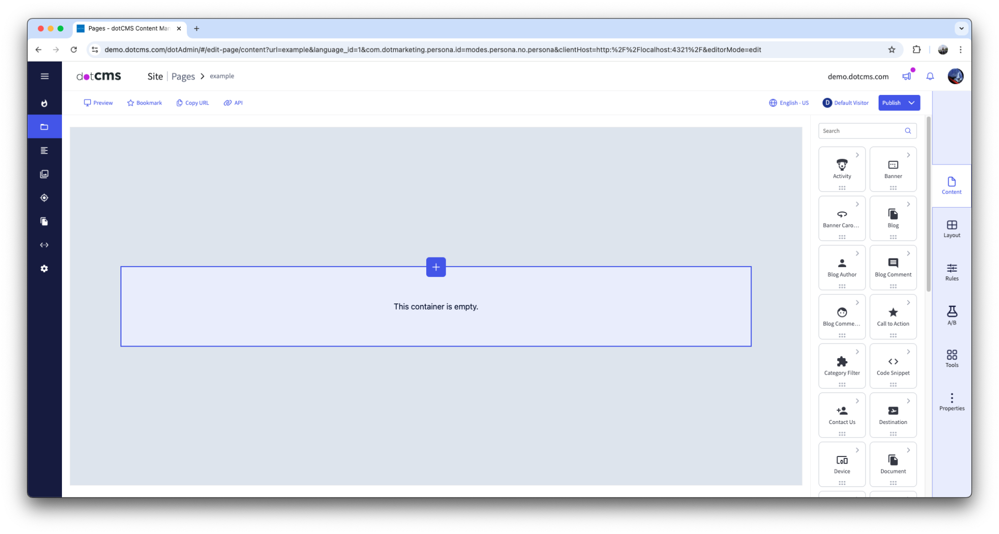 Let’s create the page we’ll use in this tutorial. Follow these steps to create the page in dotCMS: