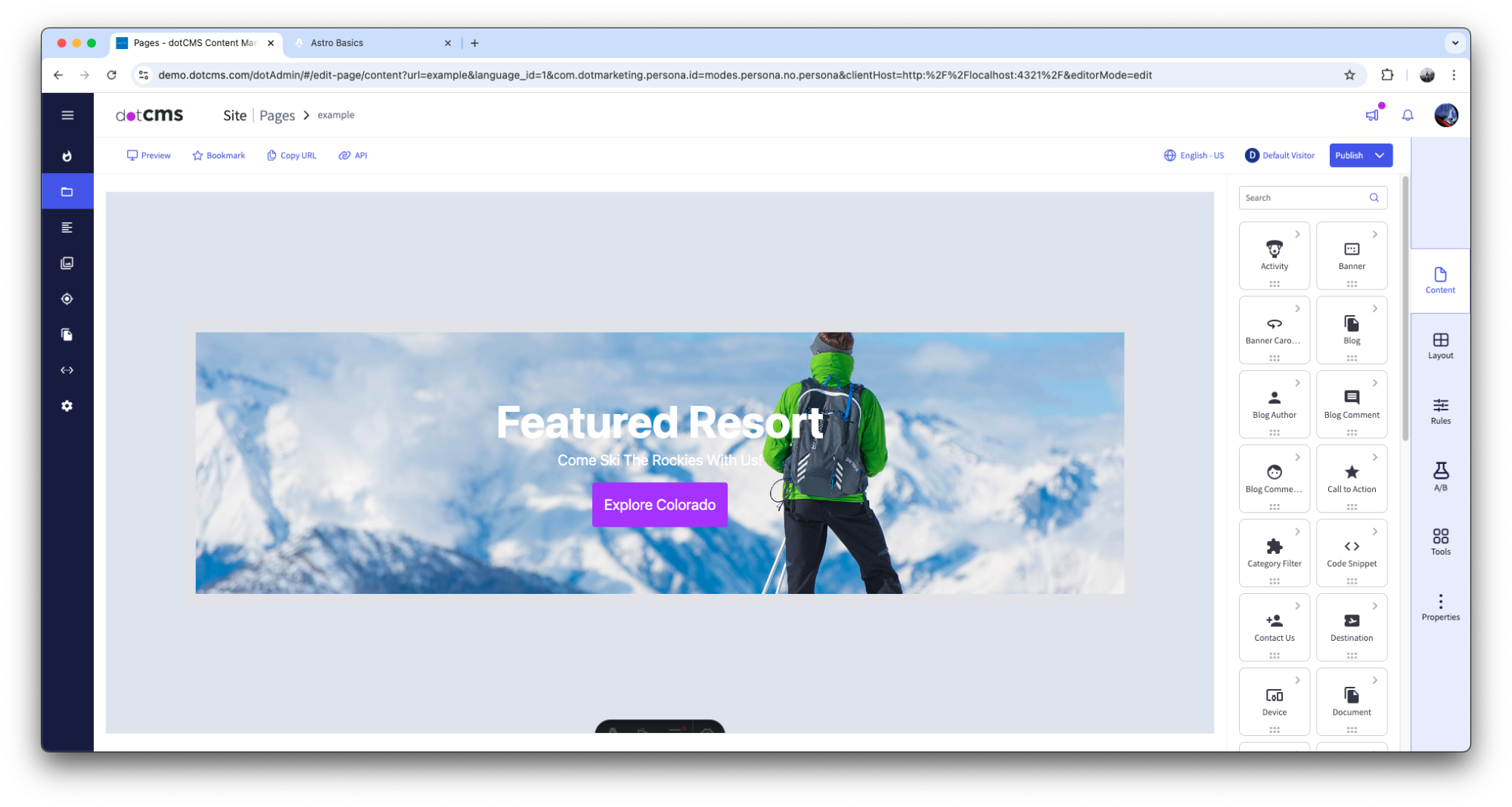 We now have an Astro page within dotCMS. The next step is to make it fully editable. This will allow content authors to modify the layout or content, and see their changes right away on the page.