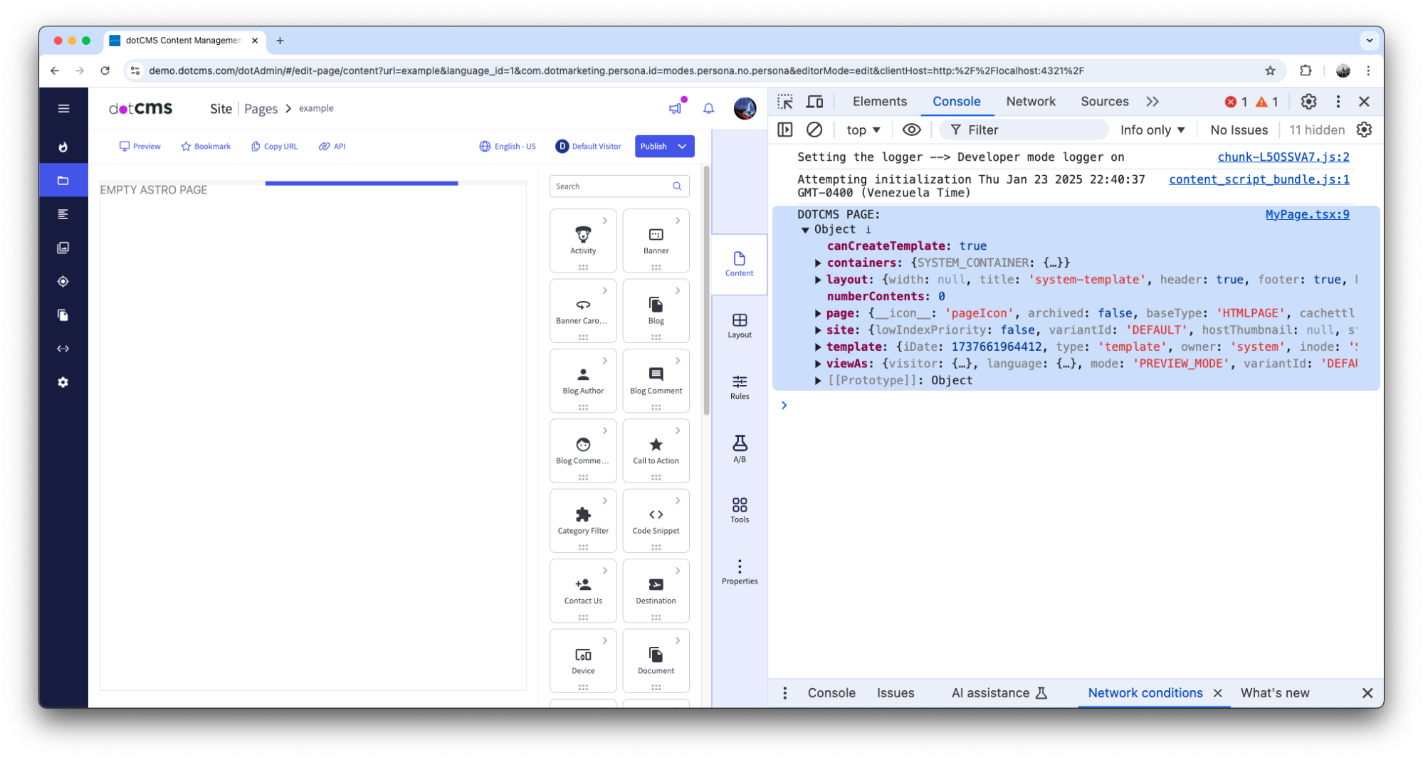 In this tutorial, we’ve successfully connected an Astro app to dotCMS, fetched page assets, rendered dynamic content, and made it editable 🥳 🚀. For the next steps, consider exploring dotCMS Content Types or the Page API to suit your app's needs.