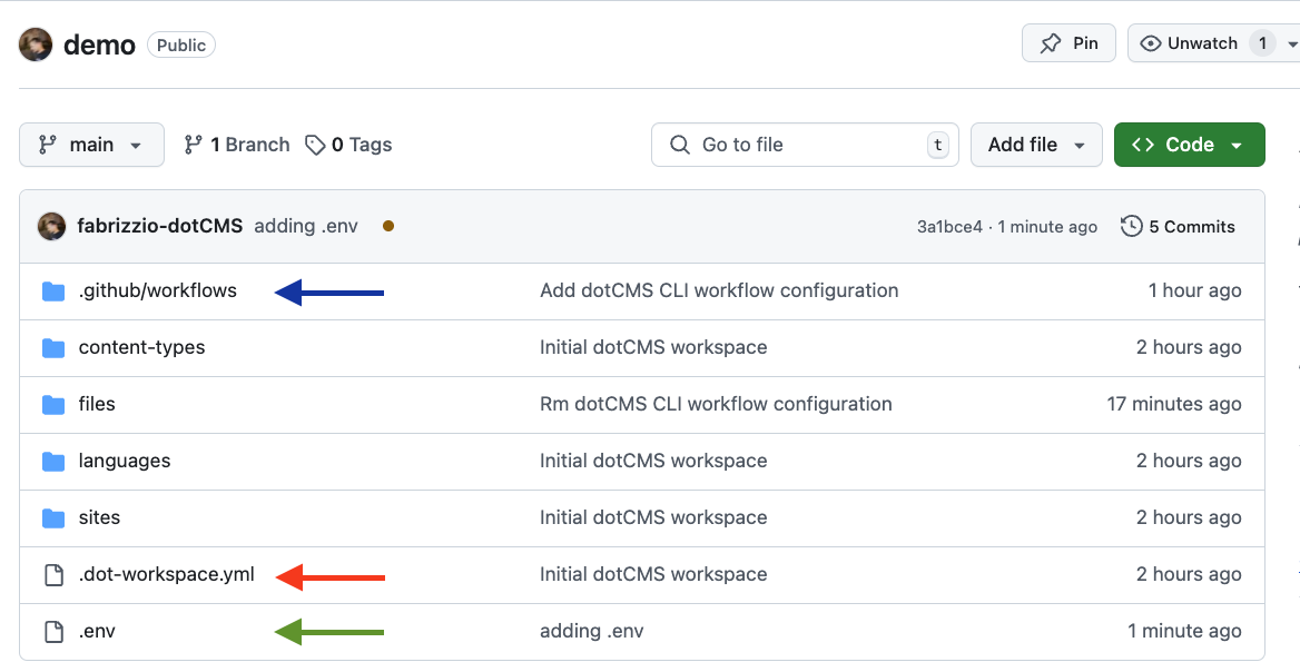 Notice the .github/workflows folder and the .dot-workspace.yml and .env files