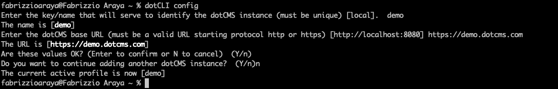 In this example, a new profile named demo was added, pointing to https://demo.dotcms.com.