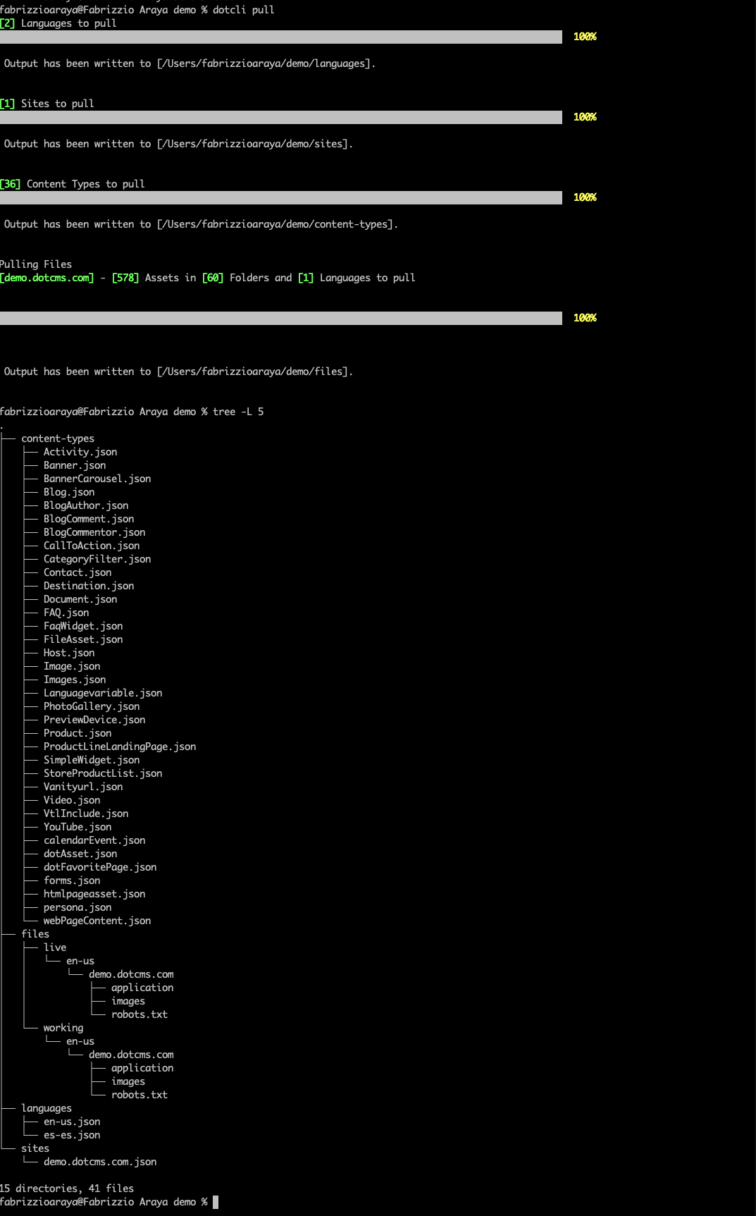 dotcli pullThis command retrieves the current configuration from the linked dotCMS instance and generates a workspace directory structure inside the cloned GitHub repository. After execution, the directory should look like this: