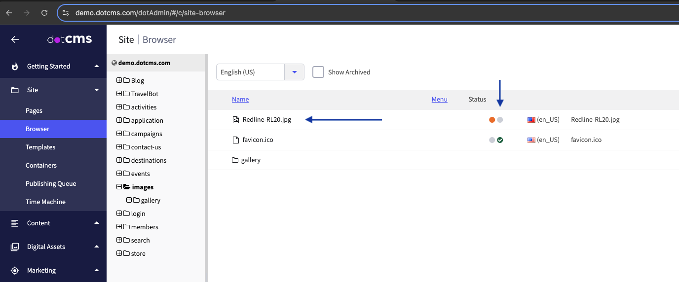 As you can see, the file was pushed into the images destination folder. It was created in status working (i.e., a draft) for the English language.