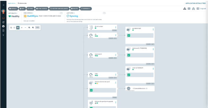 ArgoCD automatically deploys dotCMS via Helm. From the UI, you’ll see your dotCMS application, its sync status, and the health of each Kubernetes object.