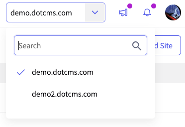 Sites are controlled by the Host system Content Type. Users with administrative permissions can see the Site Selector (see below), at the top right corner of the Content Search or Site Browser tabs.
