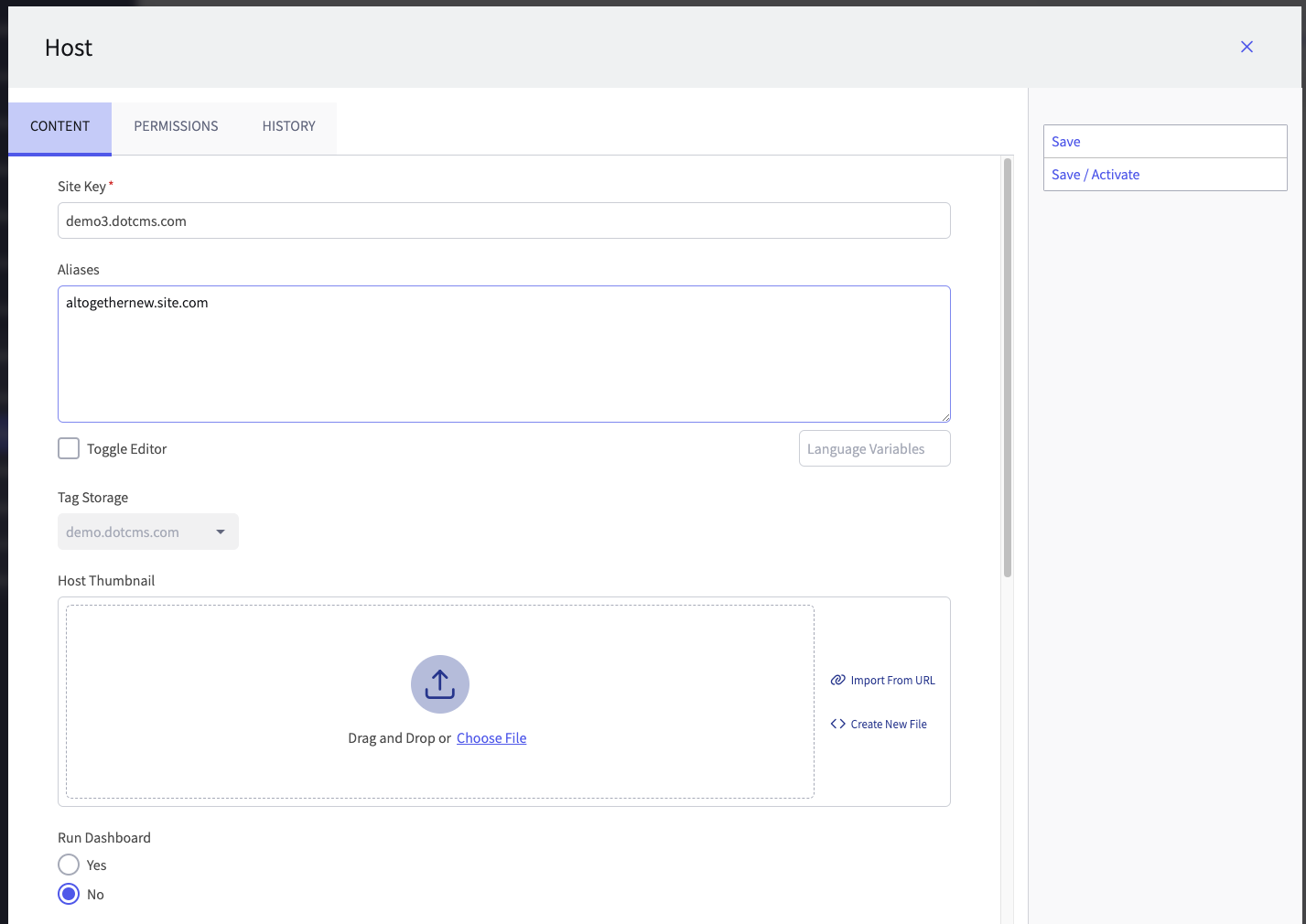 Sites typically have a site name that matches its primary domain or website address. In consequence of this, a site name is limited to a single word, though hyphens and periods can be used throughout. Additionally, the site can have alias domains that also map to the same dotCMS server (or IP address). A thumbnail for the site can also be selected to help differentiate the site from other managed sites (optional).