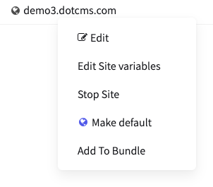 | Add To Bundle | Adds the site to a bundle for push publishing to another dotCMS server. |