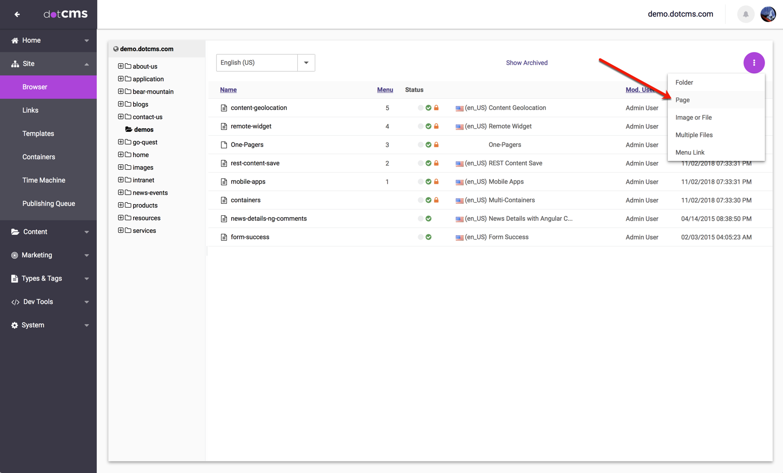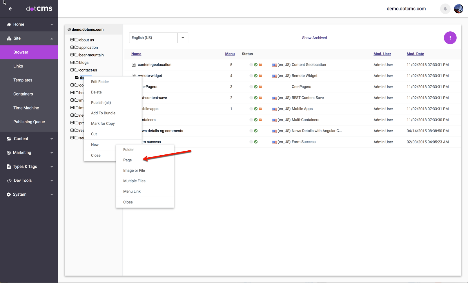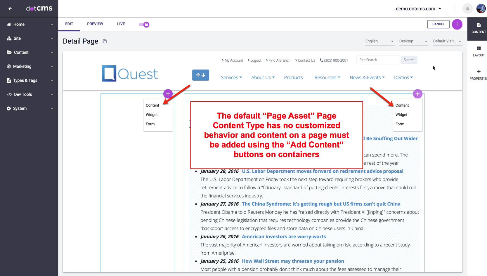 Note: The default Page Asset Content Type includes only the minimum required fields needed to create a Page. Custom Page Types can be created with additional fields.