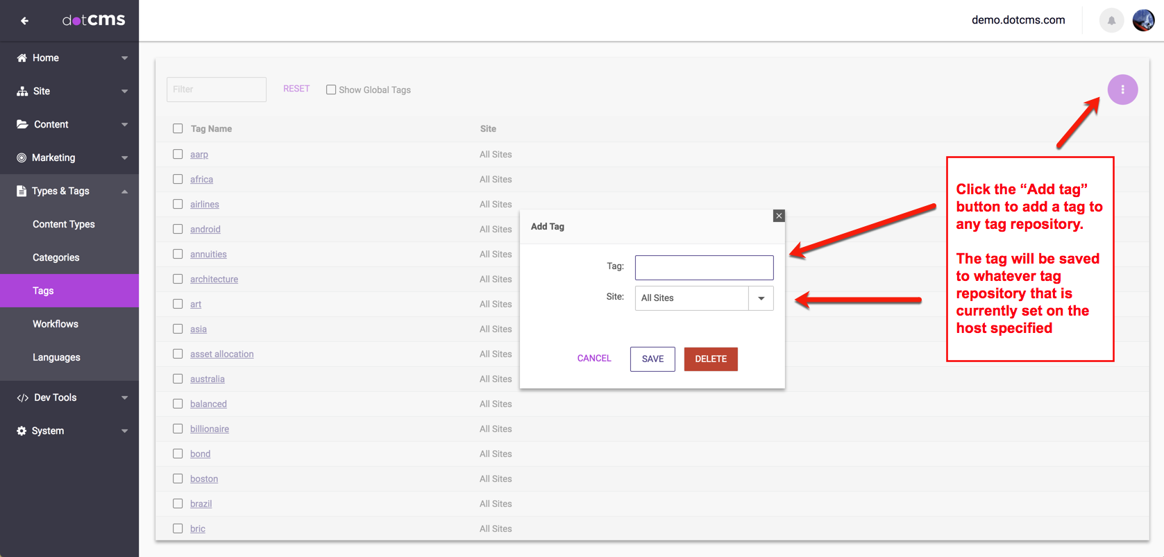 Tags can be added to a Tag Repository either from a Content tag field or from the Tag Manager.