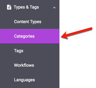 To add a new category to the system first click on the Content Types tab and select "Categories" from the drop down menu.