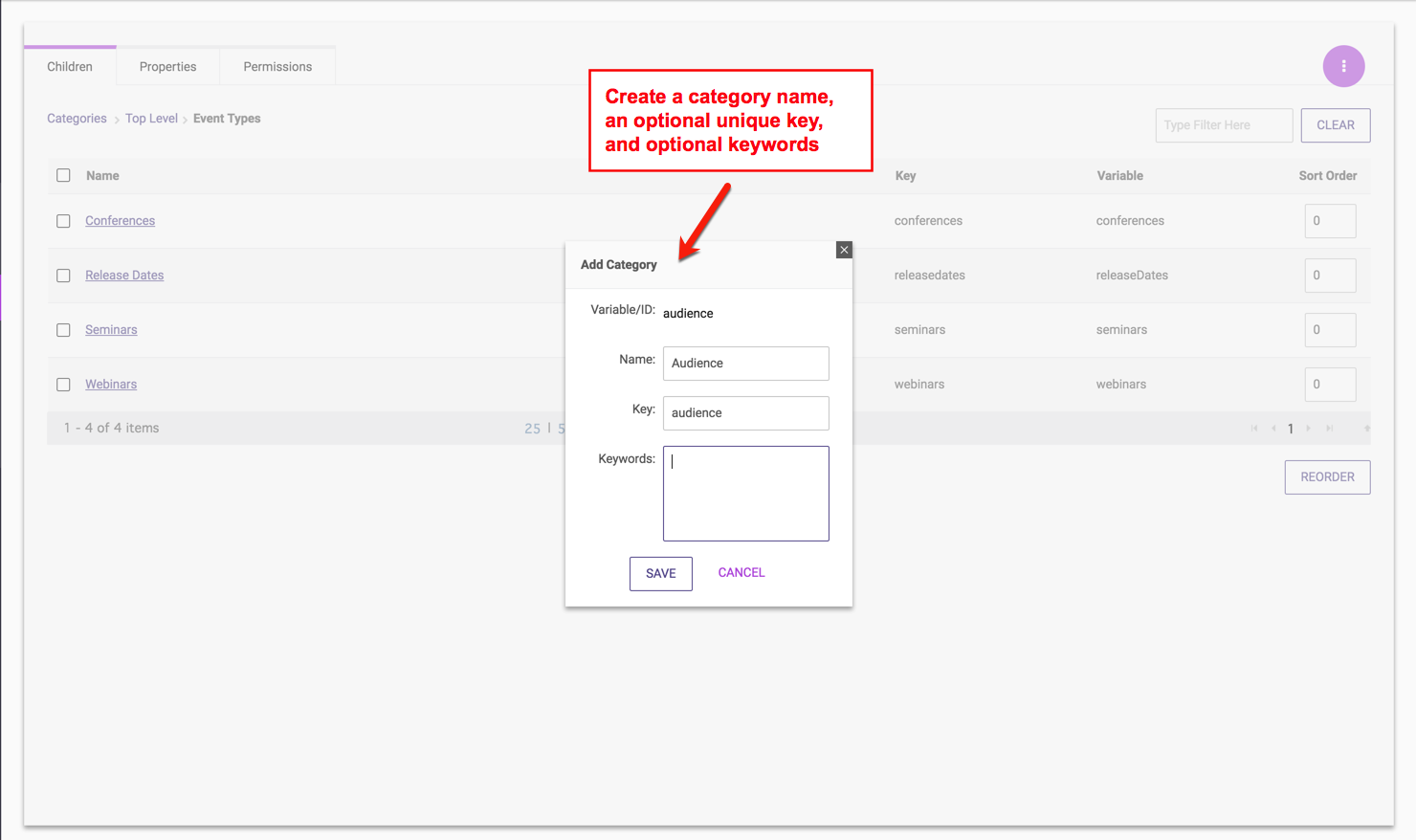 After you have saved a parent Category, click the name of that parent Category to begin adding "child" Categories under the parent.