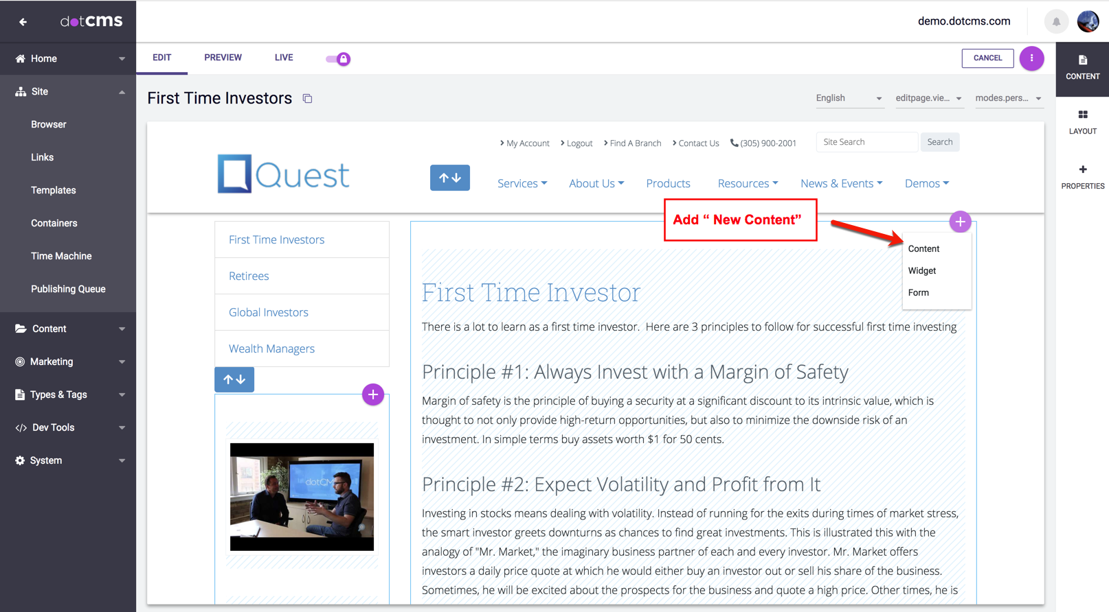 Creating/Adding New Content: Click on the "+Add Content" button and then select "New Content" from the drop down menu.