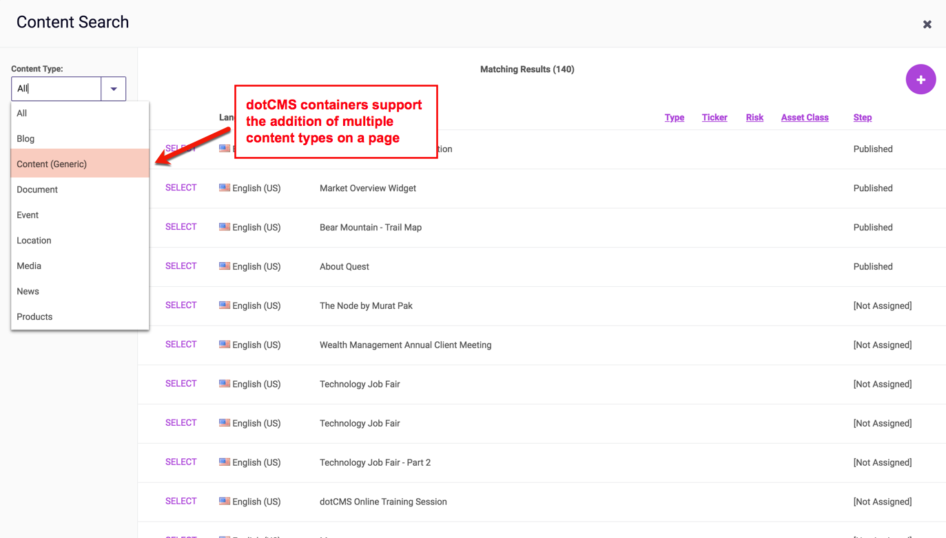 DotCMS Containers support multiple Content Types. When adding new content to a Page using a Container that supports multiple Content Types, content contributors will be asked to choose a Content Type from an allowed list of Content Types supported by the Container.