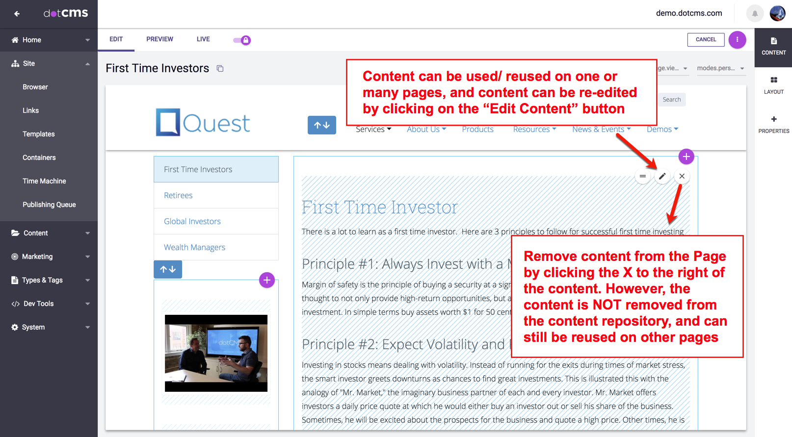 - Save/Publish - Saves a "live" version of the content viewable in Edit, Preview, and Live Mode and on the live HTML Page as long as Permissions have been set properly.