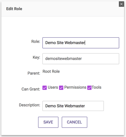 • Parent: Role to which the new role will extend permissions. If no parent role is desired, the parent Role can be left blank/set as "Root"