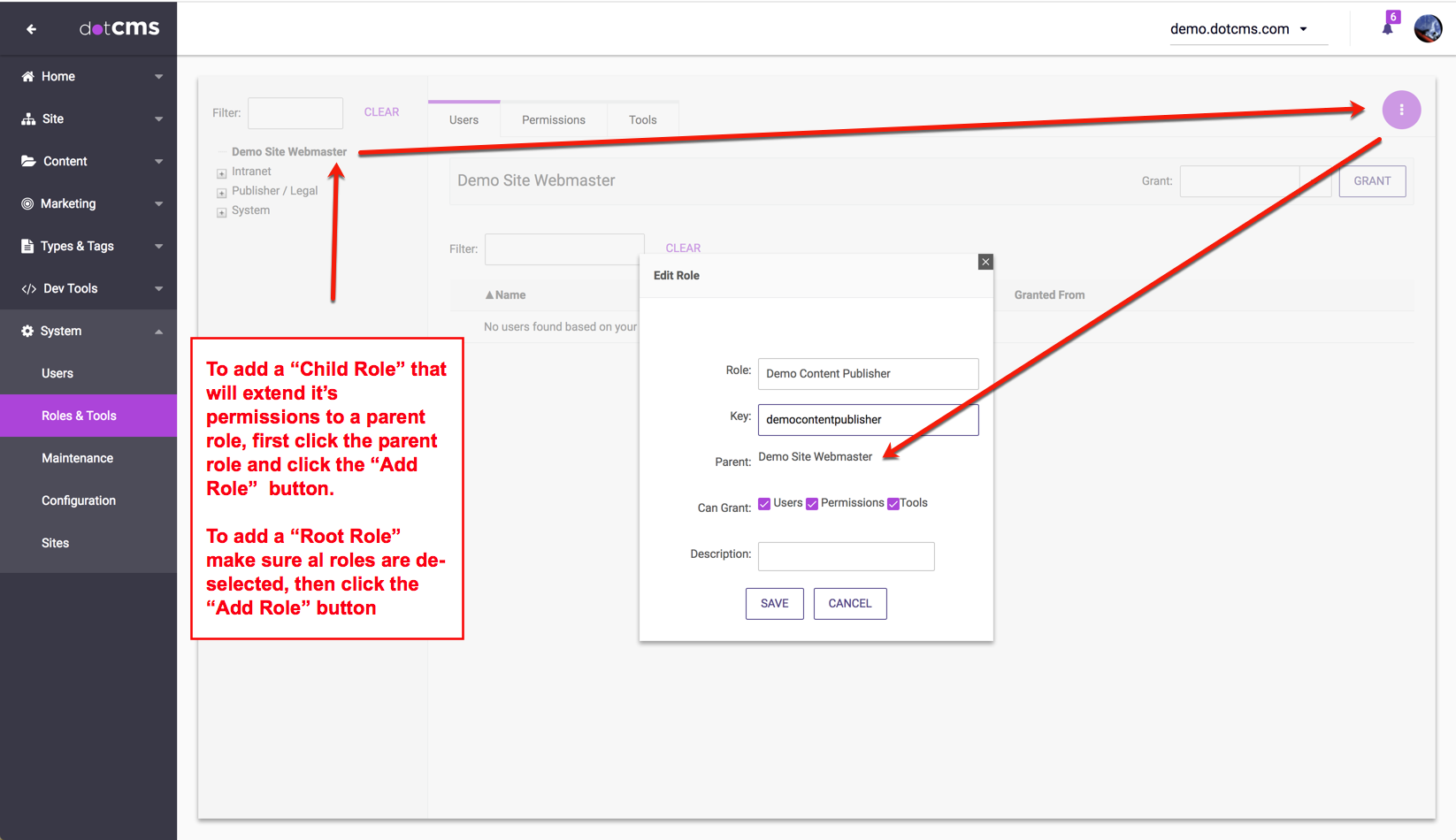*There are three tabs in the role detail area where the role's Users, Permissions, and associated CMS Tabs can be edited as long as their corresponding checkboxes were checked on the role the last time it was edited.