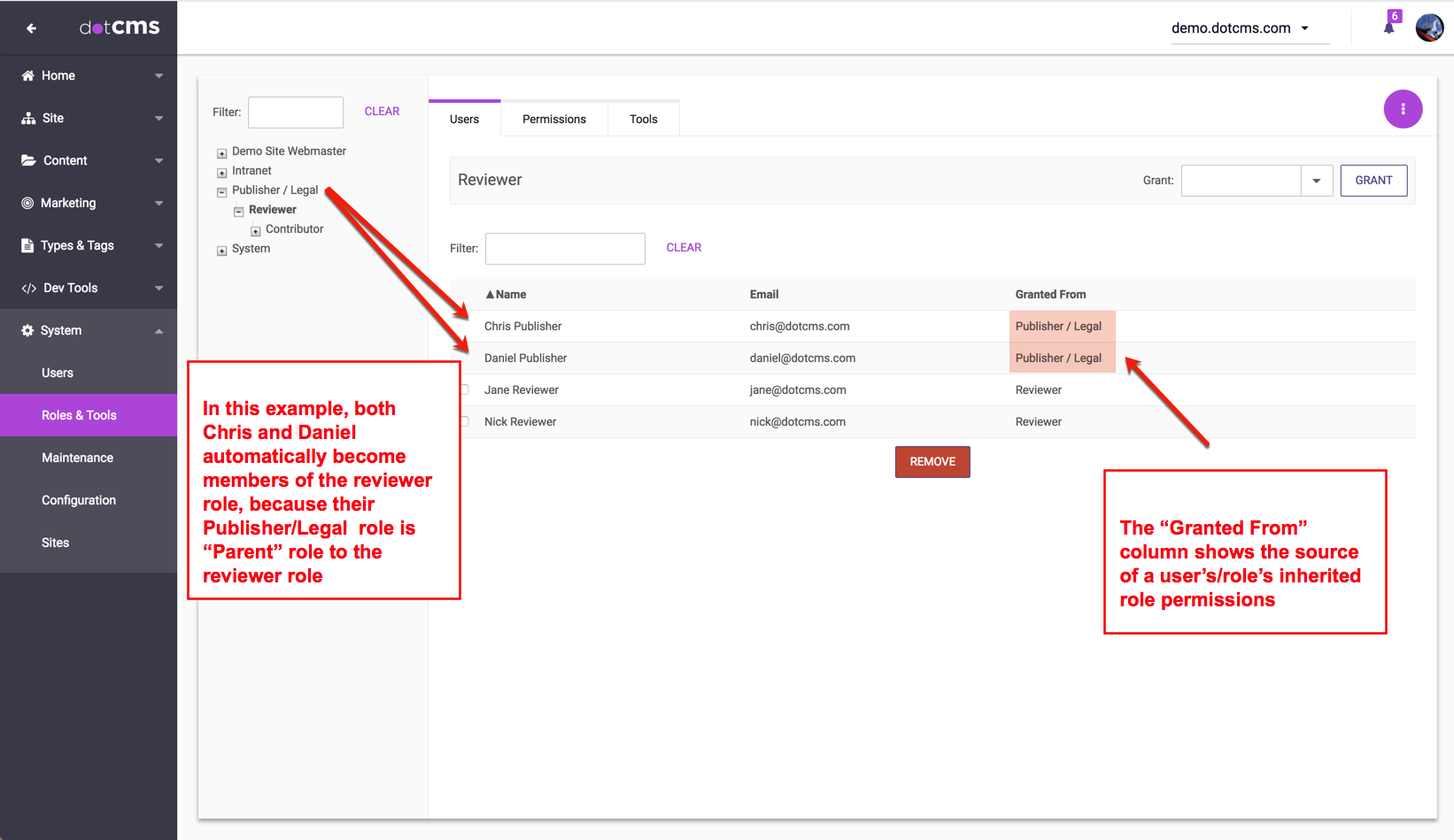 Hierarchal roles mean (in this example), that if a user is granted the Publisher/Legal role, then they are also granted the Reviewer and Contributor roles as well. The "Granted From" column displays which role the user membership is coming from. Due to the Hierarchical inheritance users assigned to the Publisher/Legal, or Reviewer Role, automatically inherit membership to the Contributor Role.
