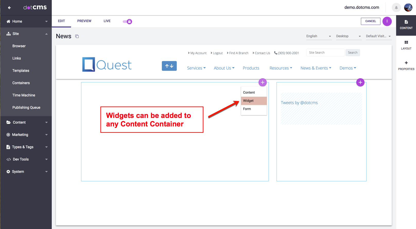 You can add a Widget to a Page from the Page Editor. You can create a new Widget from either the Content Search screen or the Content Search popup in the Page Editor.