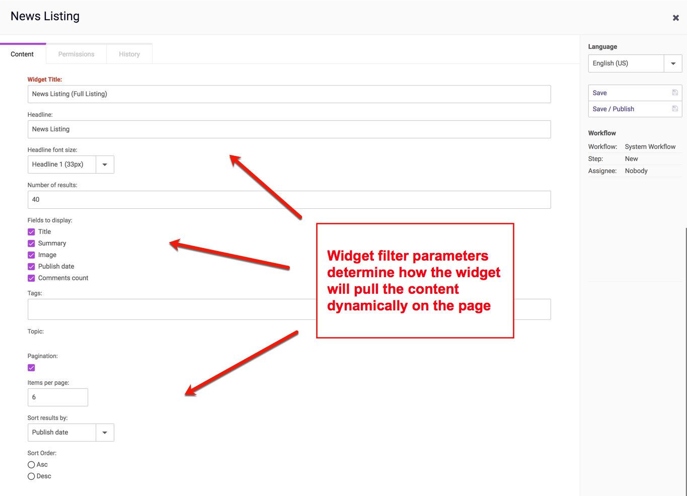 In the example provided below, the user has selected "News Listing", has set the new Widget title and has provided the filter parameters for displaying a dynamic listing of News content categorized as "Investment Banking". These parameters determine how the News Listing content dynamically displays on the page.