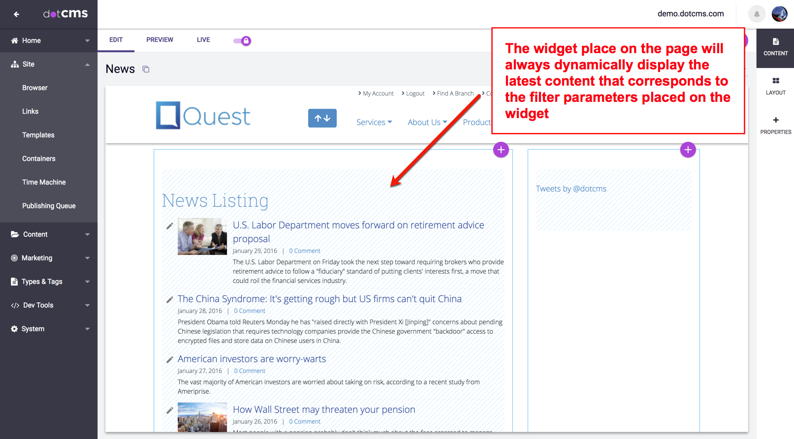 After saving the News Listing Widget to the page, the filtered News Content list displays on the Page. The News Listing Widget can be re-used on one or many Content Containers and as many dotCMS Pages as needed. All dotCMS Content Containers allow the addition of Widgets and Forms - as well as the addition of specific Content Types that have been formatted to the Container.