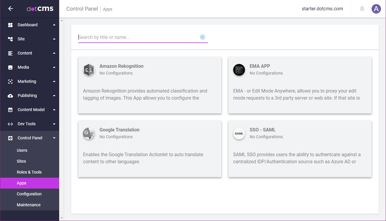 The dotCMS starter site includes several example Apps integrations, including: