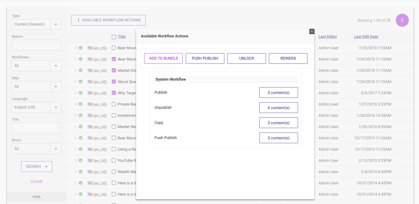 - Push Publish: Displays the Push Publish light box so you can add the contents of the Bundle to the Publishing Queue.