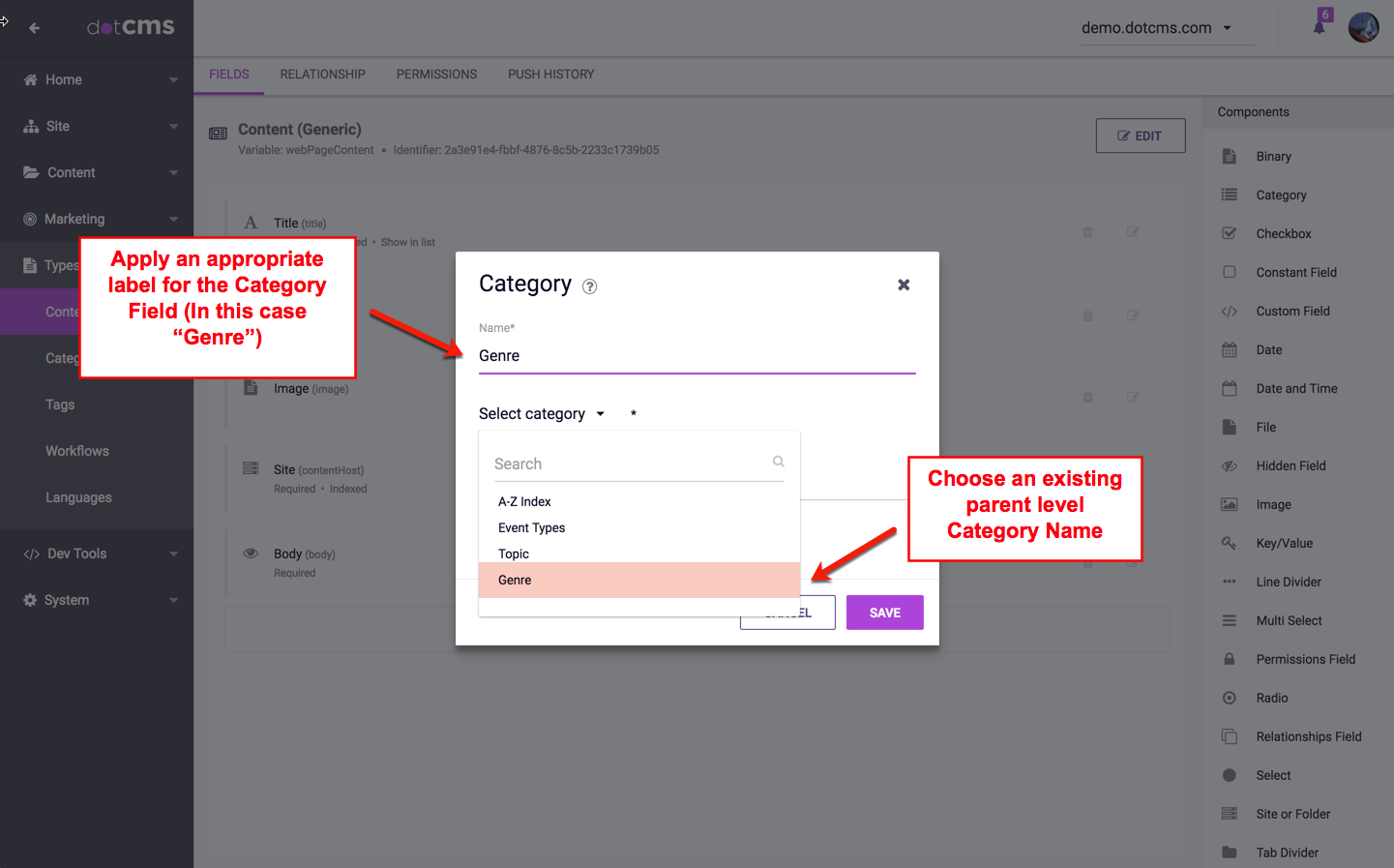 Category fields allow users to assign one or more Category values to a content item, from a top-level Category you choose.