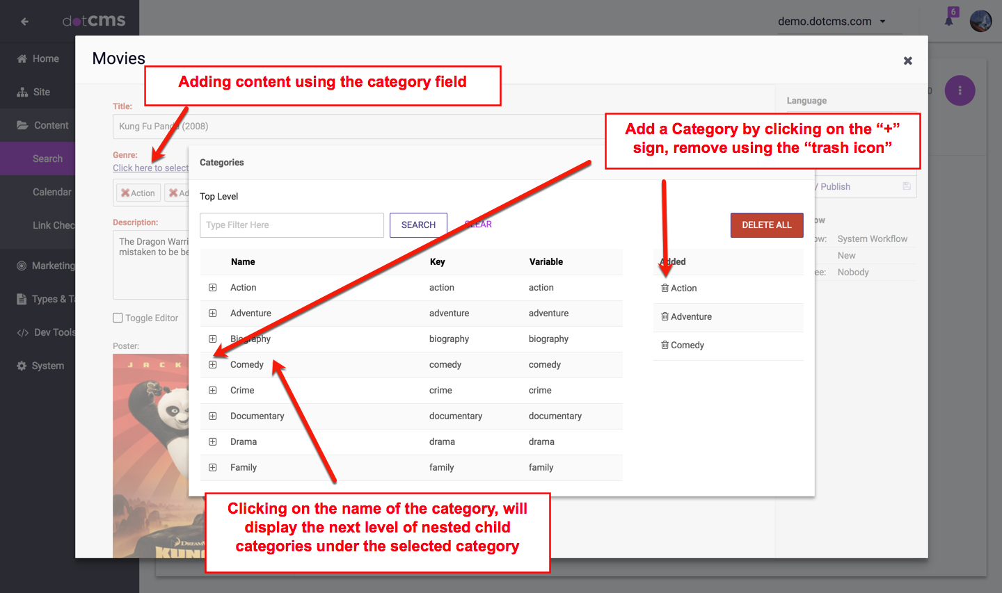 • If you wish for content contributors to be able to select from multiple categories on a single piece of content, you must add multiple category fields to that content type.