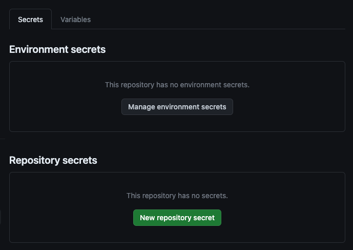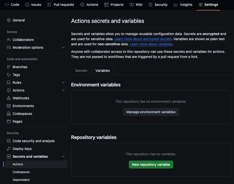 Next, browse within Settings to Secrets and Variables -> Actions. Create a new variable called DOT_API_URL and set the value to a valid dotCMS URL — e.g., https://demo.dotcms.com/api.