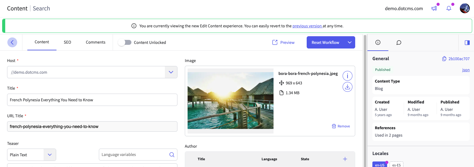 The dotCMS content editor is a built-in interface for managing individual units of content, also known as contentlets. Built with Angular components, the latest iteration of the editor is sleek and responsive, with powerful tools to manage any content efficiently.