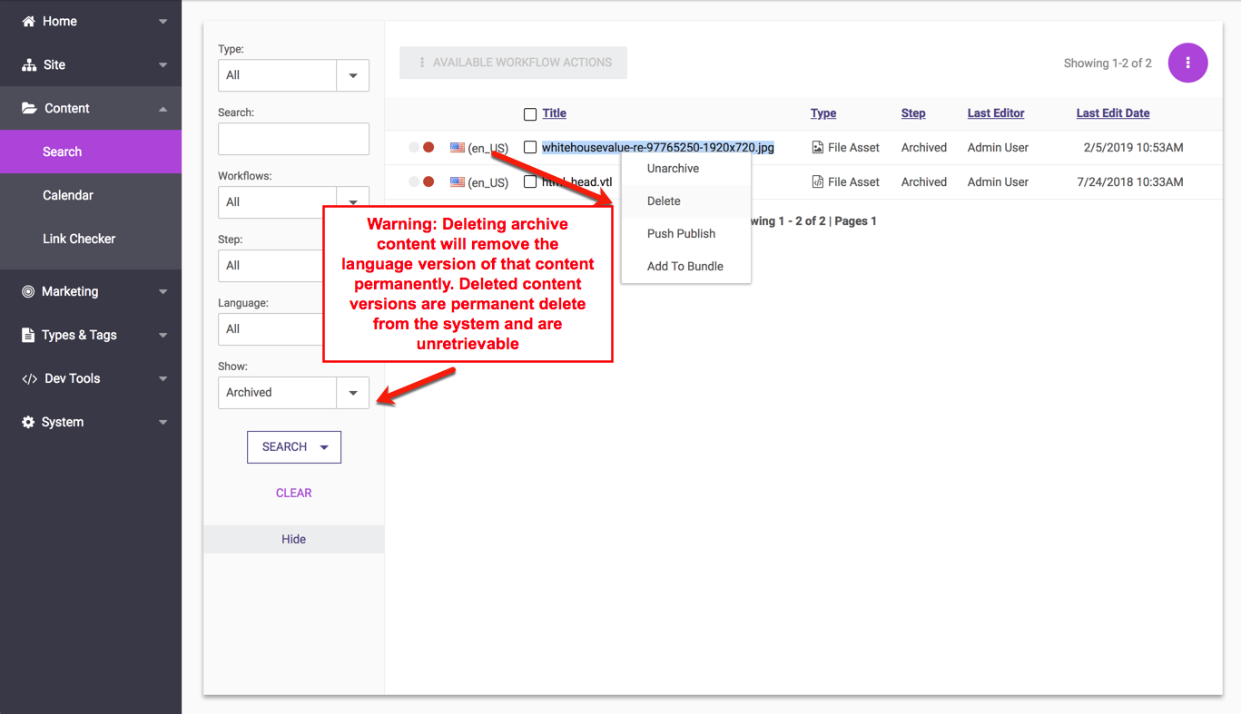 1. The archived content language version is no longer visible. To fully delete the language version, choose the "Show" filter and select "Archived". Find the language version of the content you'd like to permanently remove, and click on the "Delete" button. The specific language version is permanently removed, but the other language versions from the same contentlet/file remain and are unaffected.