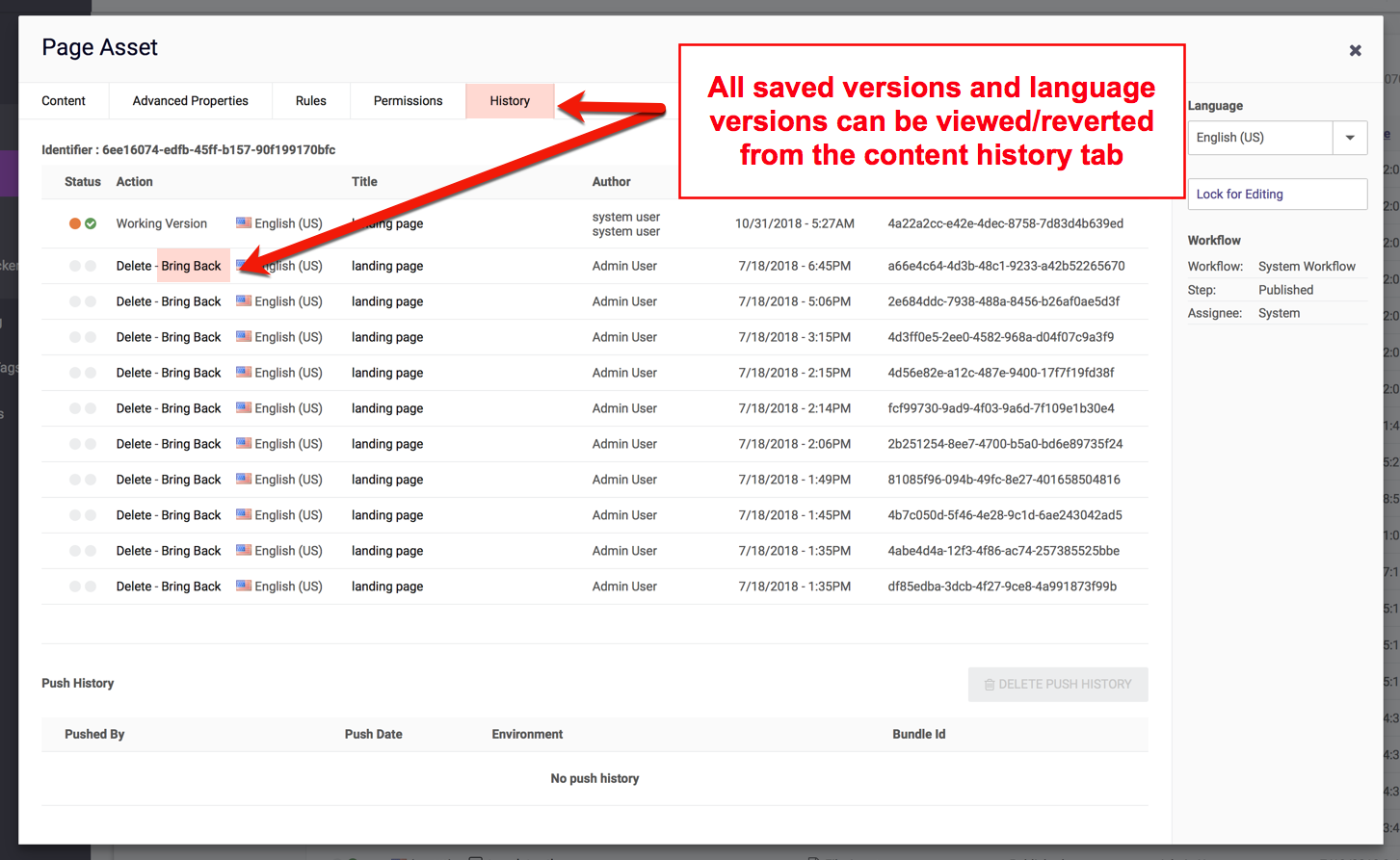 All content in dotCMS maintains a change history that lists all previous versions of the content. The change history (and each older version) of any piece of content can be viewed, and the content can be reverted to older versions if desired.