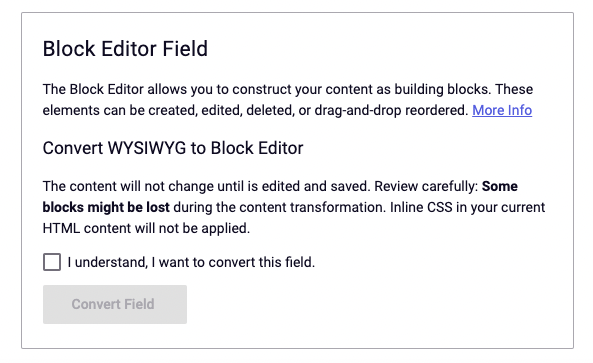 This conversion does not trigger an expensive mass data-conversion process; the only change initially is within the content type itself. New contentlets will treat the field as a Block Editor, but all previous contentlets will continue to store the field as its prior WYSIWYG HTML. When editing an older contentlet containing prior WYSIWYG data, said data will be reinterpreted on the fly as Block Editor content. As such, data will only be converted on a per-contentlet basis, on saving.
