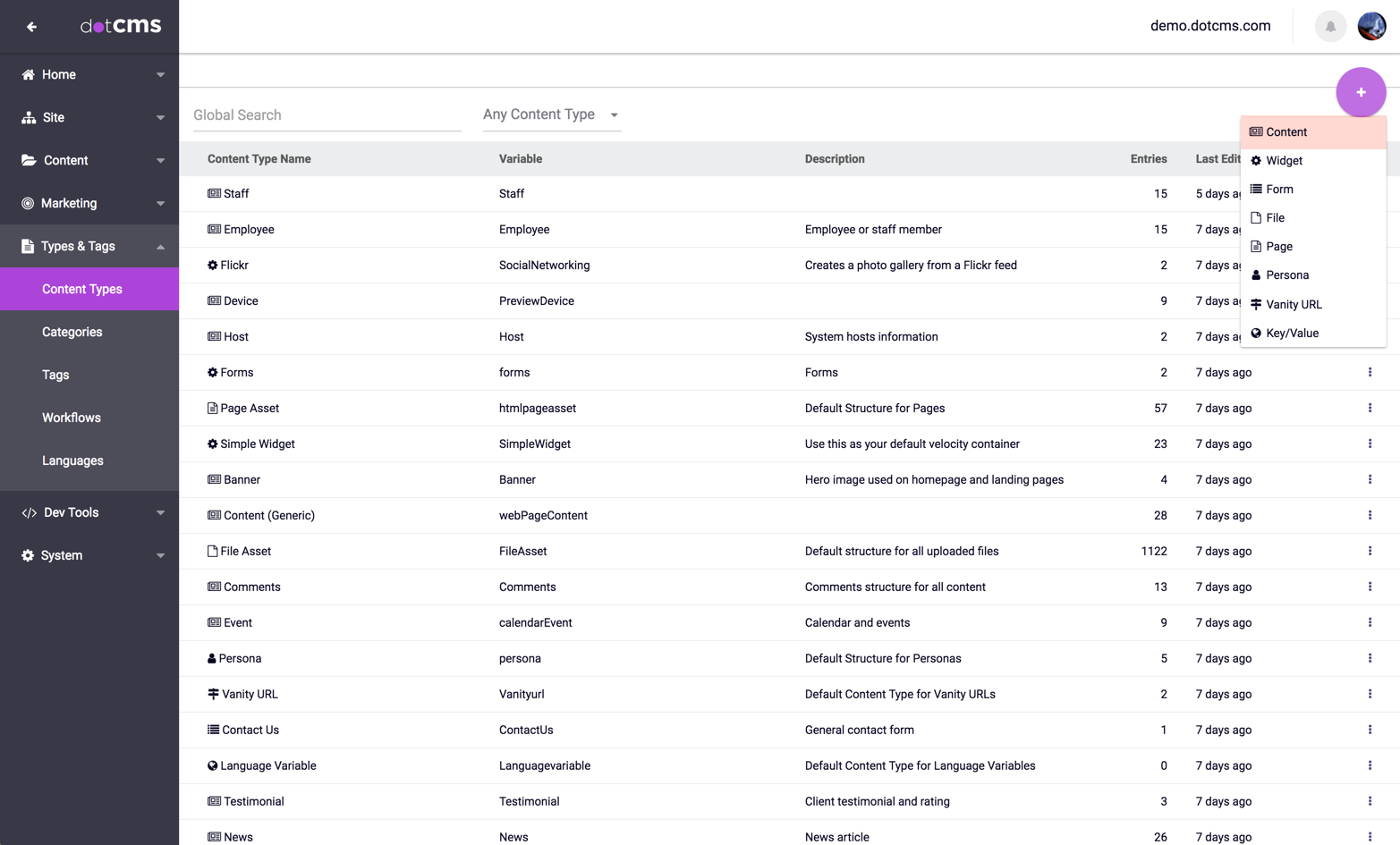 To add a Content Type, first click on the Content Types tab in the dotCMS menu. Click "+Add New Content Type" to begin creating a new Content Type.
