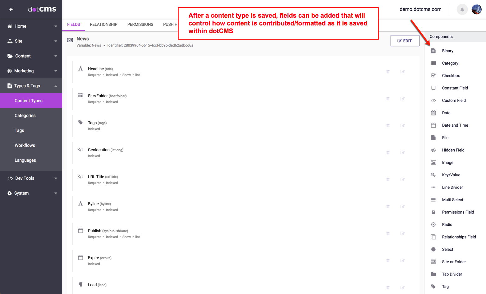 After the Content Type has been saved once, new fields can then be added and the Content Type will receive a unique Identity and a Variable/ID from the System which can be referenced in queries. New fields can be entered by clicking on the "Add New Field" button.