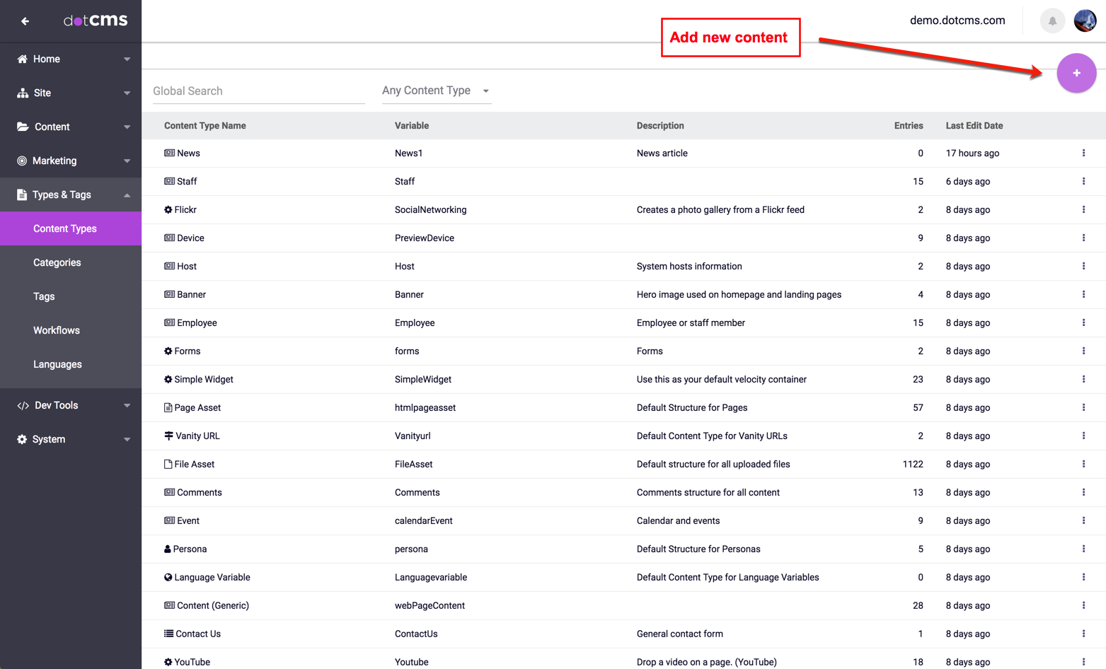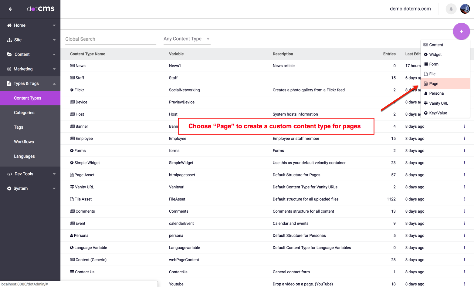 The default Page Asset Content Type has all the basic required fields to create Pages in dotCMS. However, webmasters may choose to add custom fields to Page properties to add new Page attributes or to add custom behavior to Pages. To create a custom Page Content Type, select the Content Types tab from the dotCMS backend, then click the "+Add New Content Type" button.