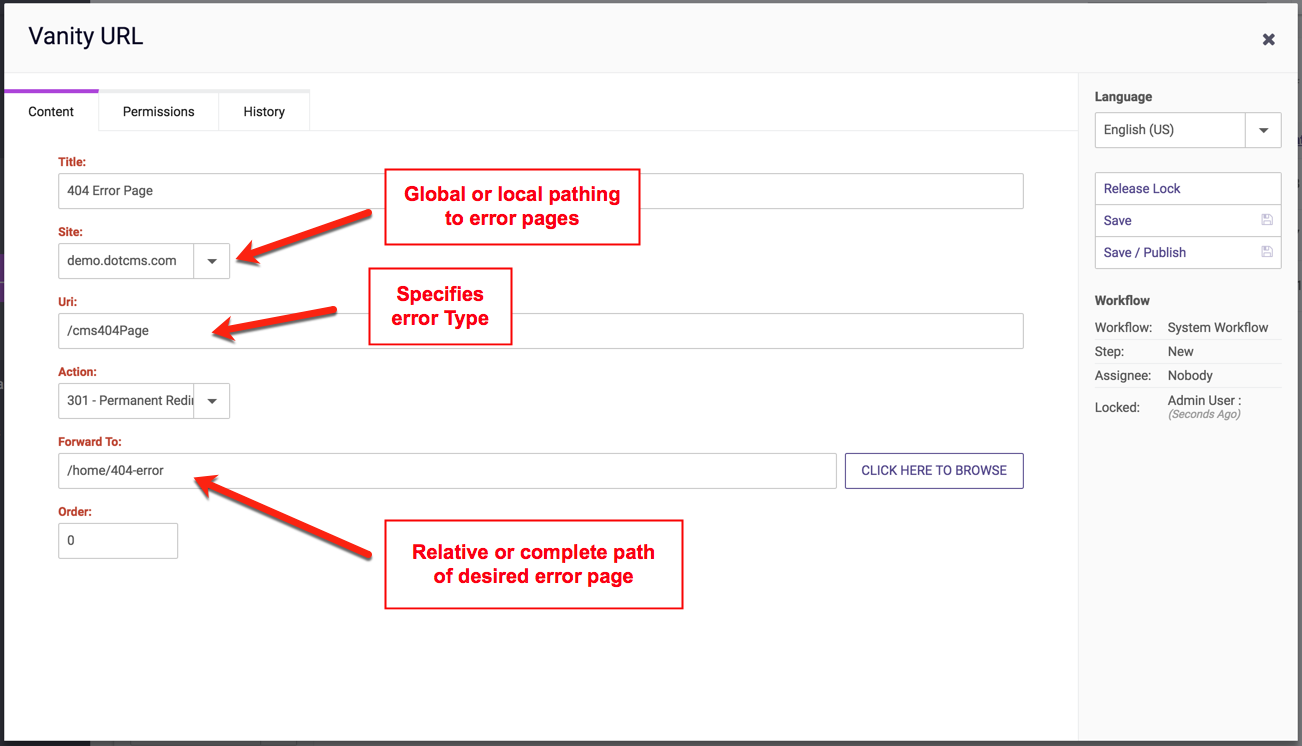 - "All Hosts" option: allows a relative or discrete path to be set for "ALL HOSTS" managed by dotCMS when handling the error type.
