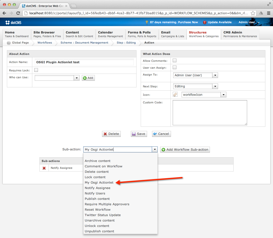 Then create a new action using the subaction: My Osgi Actionlet.