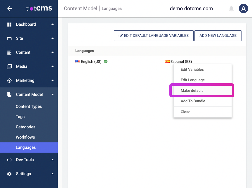 A number of system properties define and control how dotCMS displays and handles content in different languages. The most important property is the default language, which is used by default for all queries and content retrievals, and is used in the default language fallthroughs.