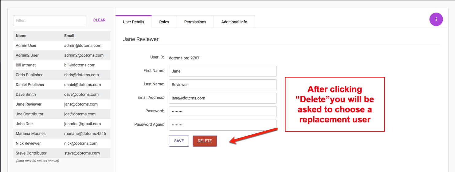 To delete/replace a dotCMS User, first go to the System→Users tab, and then click on the name of the User, and then on User Details. Beneath the User's information and password, click the Delete button.