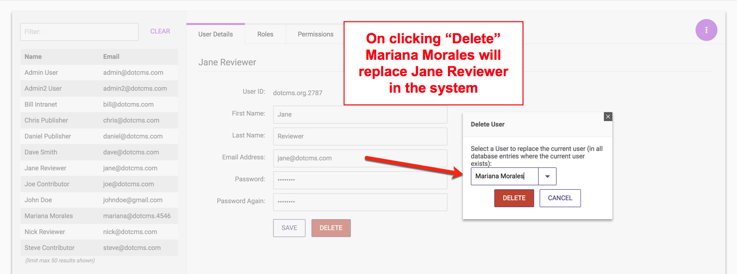 dotCMS Users can be deleted, only if they are replaced in the system by another valid User.