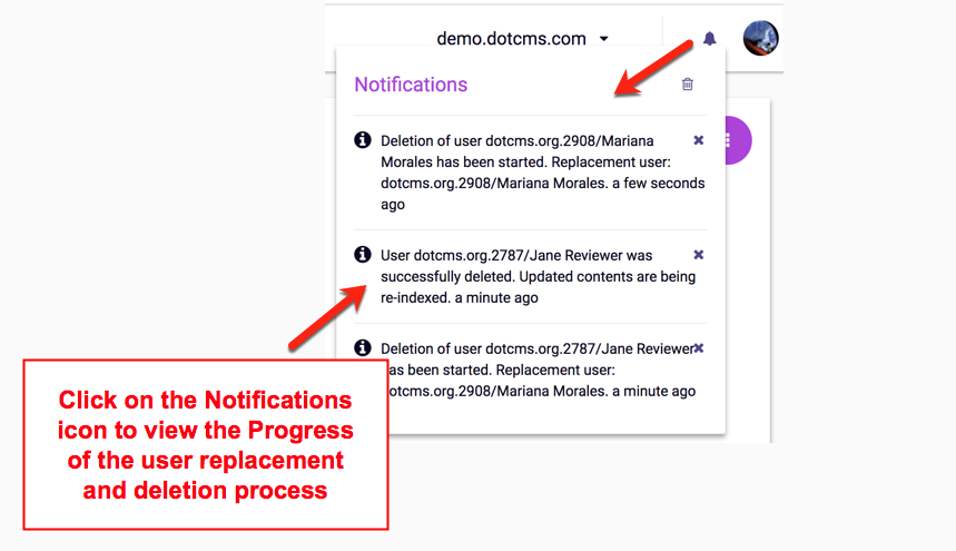The deletion/replacement of the User can be tracked by clicking on the notifications icon in dotCMS header bar, next to your Username. The notifications panel logs each replacement on each object until the user is finally deleted.