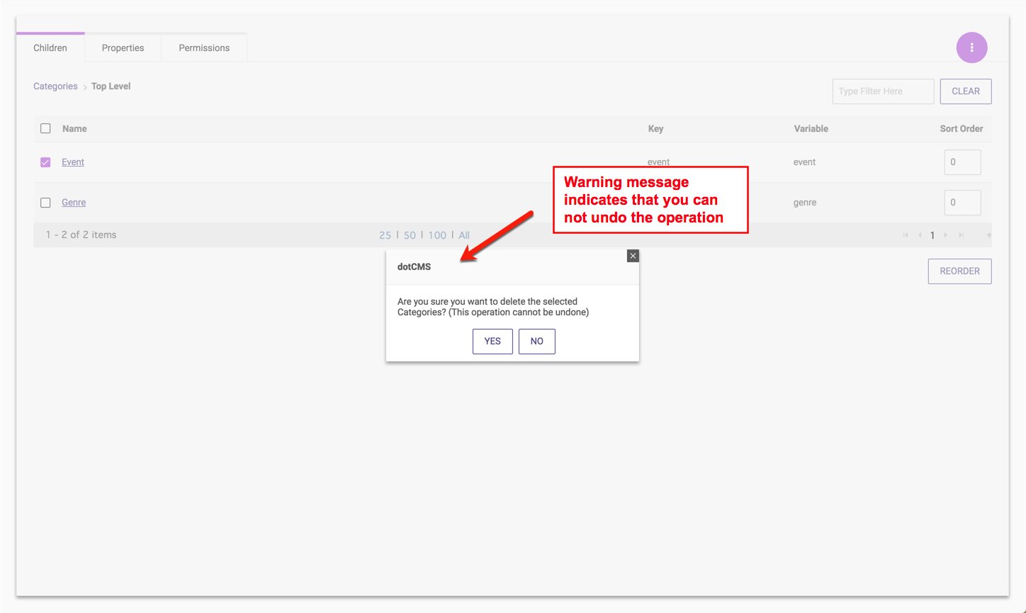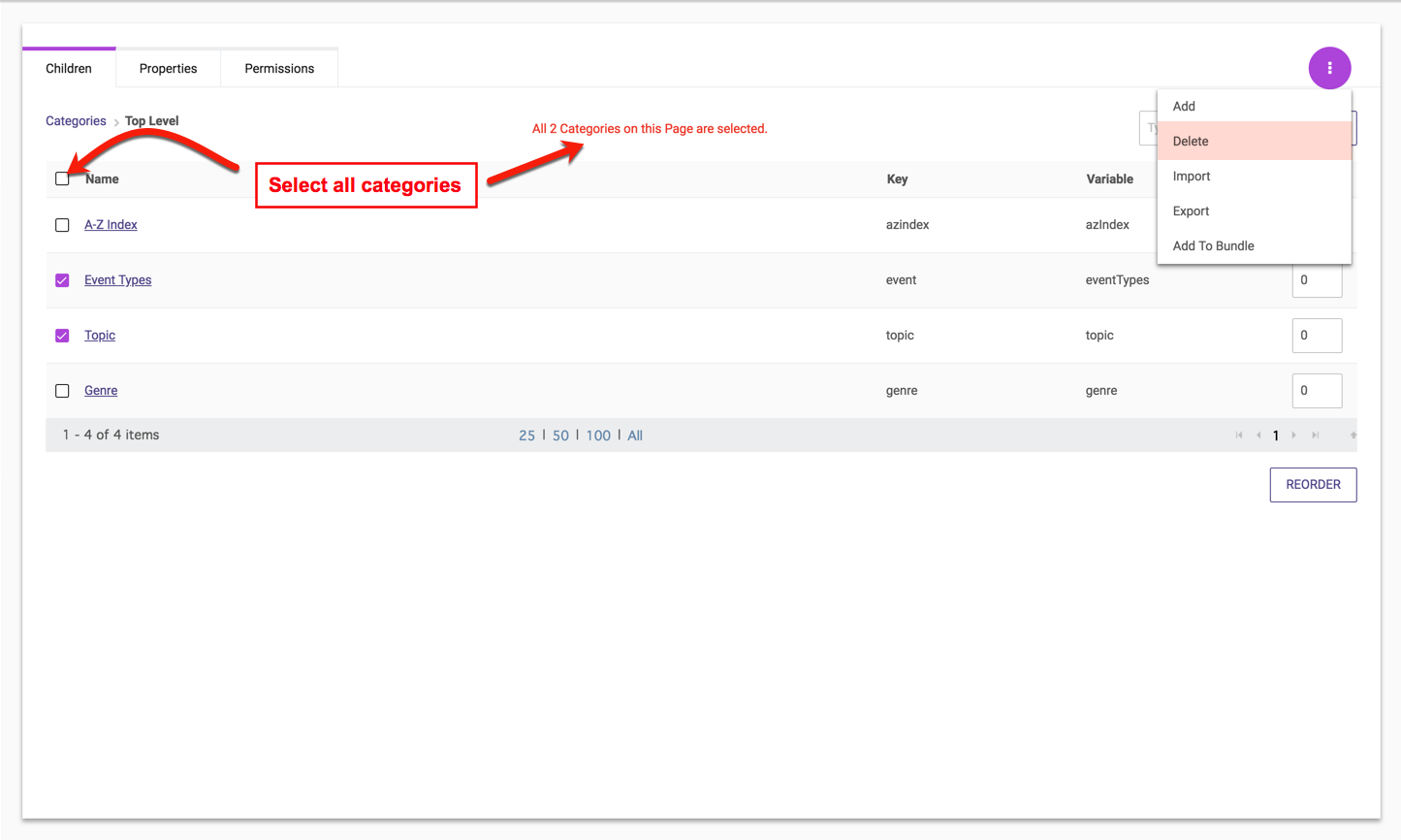 To delete a category, first make sure that it has no dependent child categories and is not being used by a category field on a Content Type (See "Deleting Categories with Dependencies" below). Then select the checkbox(es) to the left of the obsolete categories and click on the delete button.