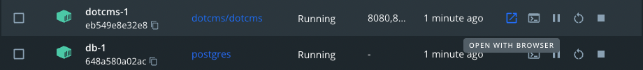 Once it's spun up the containers, you can access dotCMS on port 8082 of your Docker host (e.g. http://localhost/). If you're using the Docker Desktop application, its dashboard will also surface an "Open in Browser" button under its Containers menu: