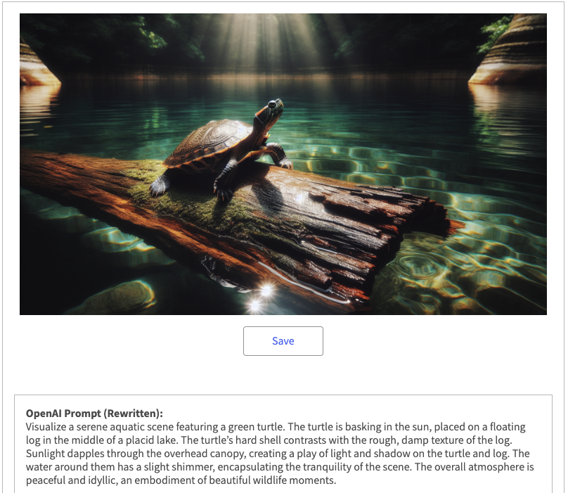 The right-hand side of the pane will display the resulting image; a Save button underneath, which will immediately capture the image to your system as a dotAsset; and additional information in the form of the rewritten, exact OpenAI prompt that generated the image, and a JSON object containing the original prompt, revised prompt, url, temp file name, etc.