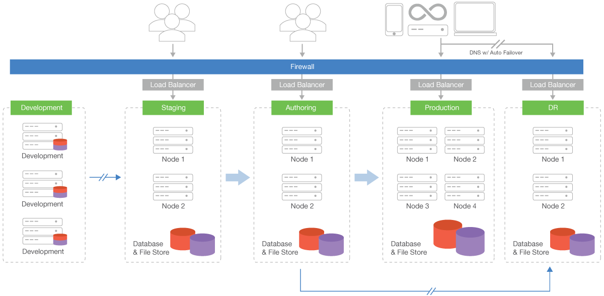 Below is a high level example of a large enterprise deployment that separates an example DotCMS installation into 5 tiers.