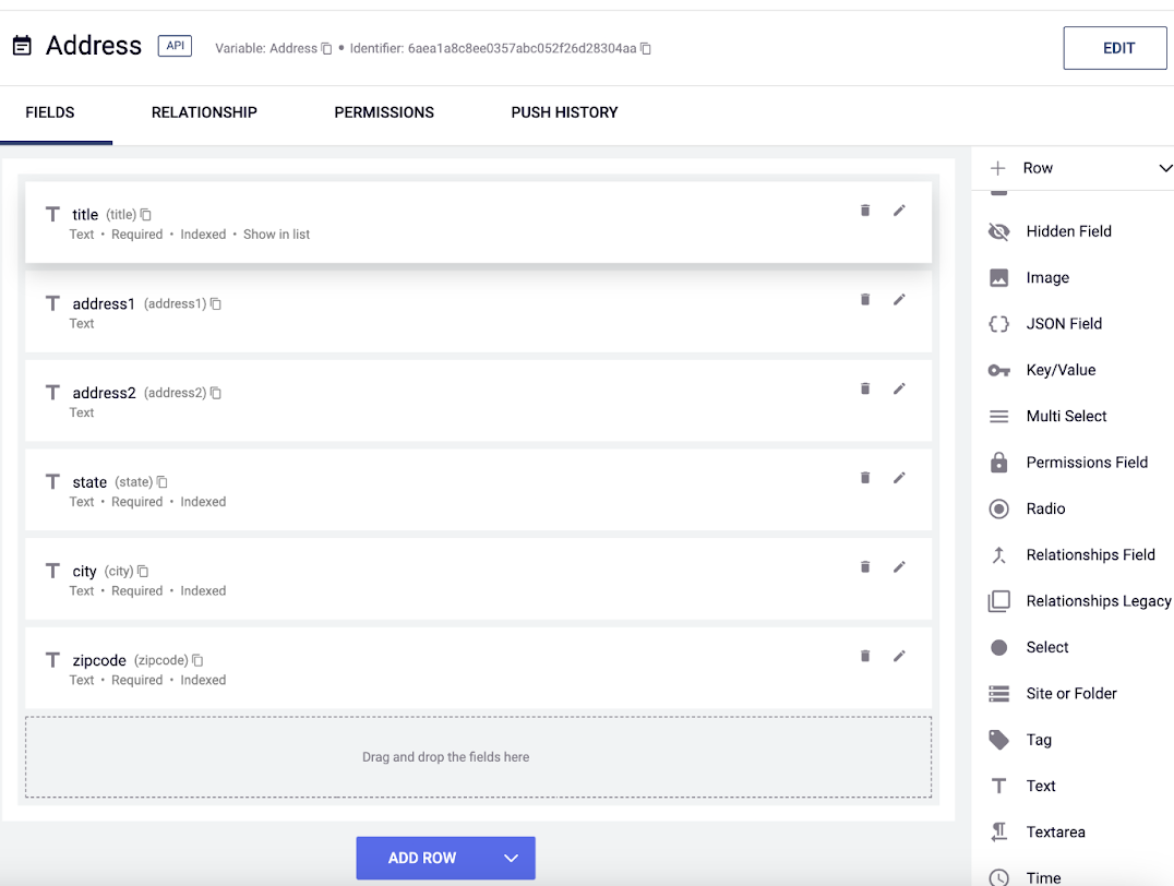 We'll begin by creating a Content Type to serve as a dummy. We'll name it Address, and it will consist of six Text fields named title, address1, address2, state, city, and zipcode.